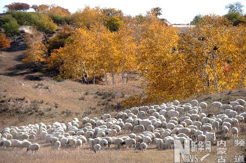 羊群在內(nèi)蒙古克什克騰旗境內(nèi)的林中吃草。 金秋時節(jié),內(nèi)蒙古草原進(jìn)入牲畜出欄旺季。據(jù)內(nèi)蒙古自治區(qū)農(nóng)牧業(yè)廳夏季牧業(yè)普查結(jié)果顯示,2008年牧業(yè)年度,內(nèi)蒙古自治區(qū)出欄牲畜達(dá)7264萬頭(只)。(張嶺)