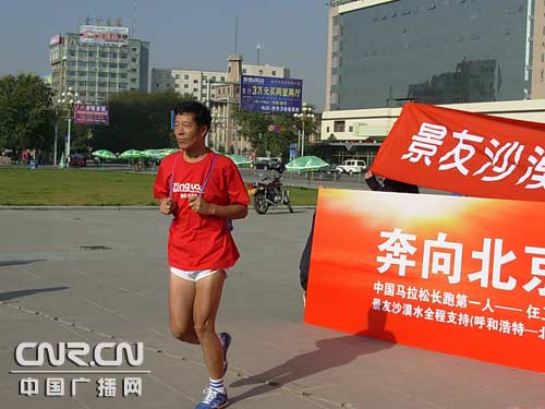 中廣網(wǎng)呼和浩特10月14日消息(記者那森寶音、任艷君) 被譽(yù)為“中國民間馬拉松長跑第一人”的呼和浩特市市民任衛(wèi)東,13日啟程前往首都參加2008北京國際馬拉松賽。與以往不同的是,此次前往首都任衛(wèi)東要用五天的時(shí)間從呼和浩特跑到北京(全程467公里)。