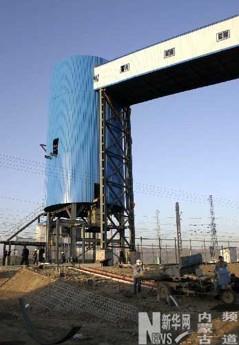 這是投入試用的古城灣煤炭裝車基地裝煤塔(攝于10月14日)。 近日,呼和浩特鐵路局包頭古城灣萬噸環(huán)保煤炭裝車基地基本建成并試運(yùn)行。 新華社記者 劉軍 攝