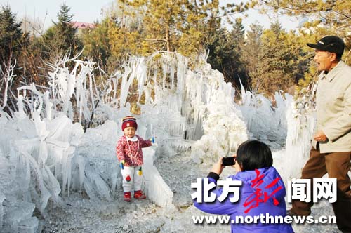 17日,呼和浩特市烏蘭夫公園的美麗“樹掛”吸引了一些市民駐足拍照。連日來氣溫持續(xù)下降,烏蘭夫公園在給樹木澆凍水時,噴濺出的水落在樹上,形成了猶如美麗樹掛一般的冰柱,許多市民特意前來感受冬的氣息。 (孫慧)