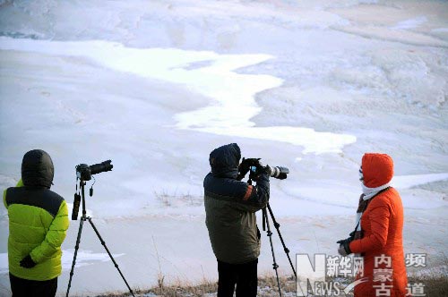 12月27日,旅游者在內(nèi)蒙古克什克騰旗西拉沐倫河積雪的冰面上等待拍攝。從12月27日至29日,內(nèi)蒙古自治區(qū)出現(xiàn)2008年入冬以來(lái)最大范圍的降雪天氣。全區(qū)自西向東大部分地區(qū)陸續(xù)降雪普遍在5毫米左右。 新華社記者 張領(lǐng) 攝