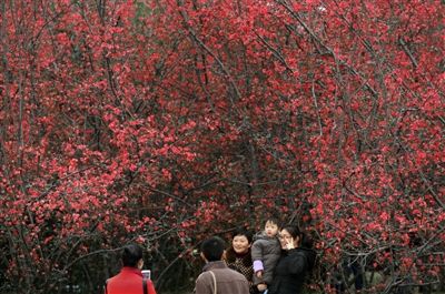 昨日,游客在金沙遺址紅梅樹下合影。