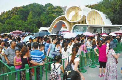 10月2日,成都大熊貓繁育研究基地門口排起長龍。有游客笑稱,熊貓基地已經(jīng)變成人類基地了。 張磊攝
