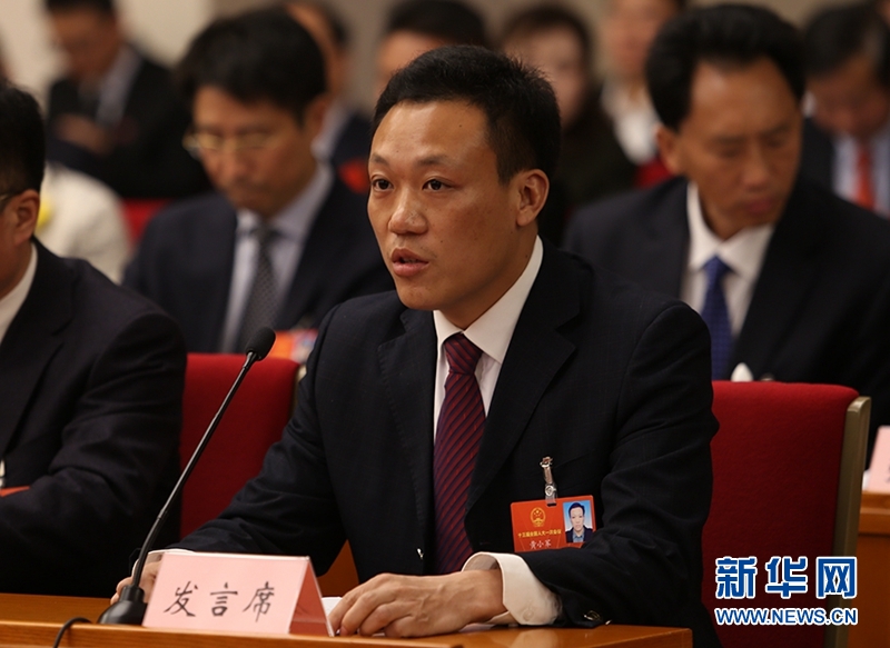 全國(guó)人大代表、四川省渠縣巨光鄉(xiāng)金土村黨支部第一書(shū)記黃小軍在發(fā)言。新華網(wǎng)曹鵬攝