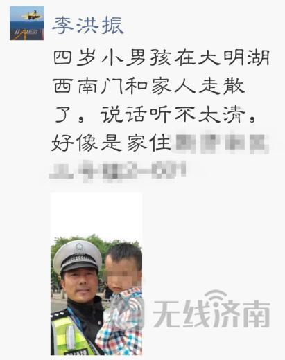 上午11點左右,正在大明湖西南門執(zhí)勤的交警李洪振遇到一名小男孩,孩子向自己求助稱找不到自己的家長了。民警了解情況后,立即將小男孩帶到安全區(qū)域,并向指揮中心匯報。