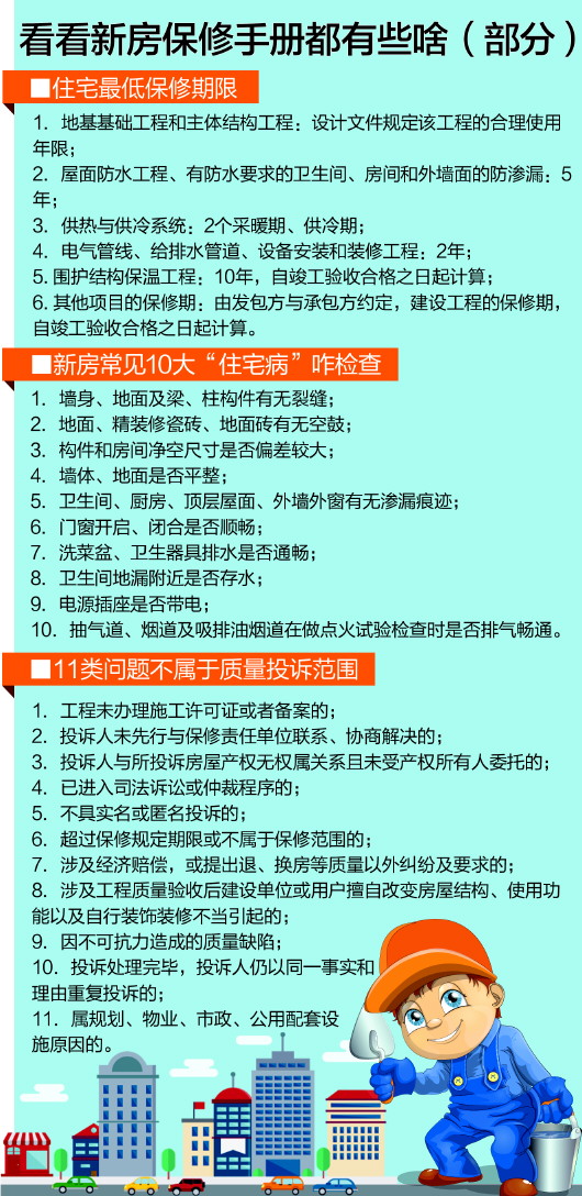 記者看到,保修手冊一共15條,列舉了新建住宅交房、維修等常見問題和解決辦法,可謂是造福青島新房業(yè)主的一本“保修秘籍”。