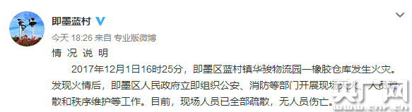 央廣網(wǎng)青島12月1日消息(記者 劉?)記者從青島市即墨區(qū)藍(lán)村鎮(zhèn)官方微博獲悉,今天(1日)16時(shí)25分,青島市即墨區(qū)藍(lán)村鎮(zhèn)華駿物流園一橡膠倉庫發(fā)生火災(zāi)。發(fā)現(xiàn)火情后,即墨區(qū)人民政府立即組織公安、消防等部門開展現(xiàn)場滅火、人員疏散和秩序維護(hù)等工作。目前,現(xiàn)場人員已全部疏散,無人員傷亡。