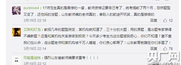 19日當(dāng)天考試結(jié)束后,參加教育類考試的考生就在山東省教育廳和山東省教育招生考試院的官方微博上反映,這次考試的試題與某考試機(jī)構(gòu)的部分原題相同。網(wǎng)友@艾琳和燈泡說(shuō):“教招幾年的題型突變,某機(jī)構(gòu)就知道了,三十分的大題,用的原題,是出題專家懶得不編新題?還是和某機(jī)構(gòu)關(guān)系親密到極致?今天多少考生為這份題感到惡心,你們不知道?查不查我們也認(rèn)命,但出題老師和某機(jī)構(gòu)被千萬(wàn)人唾罵,你們良心都黑了!山東教育就瞎在你們手里了!”