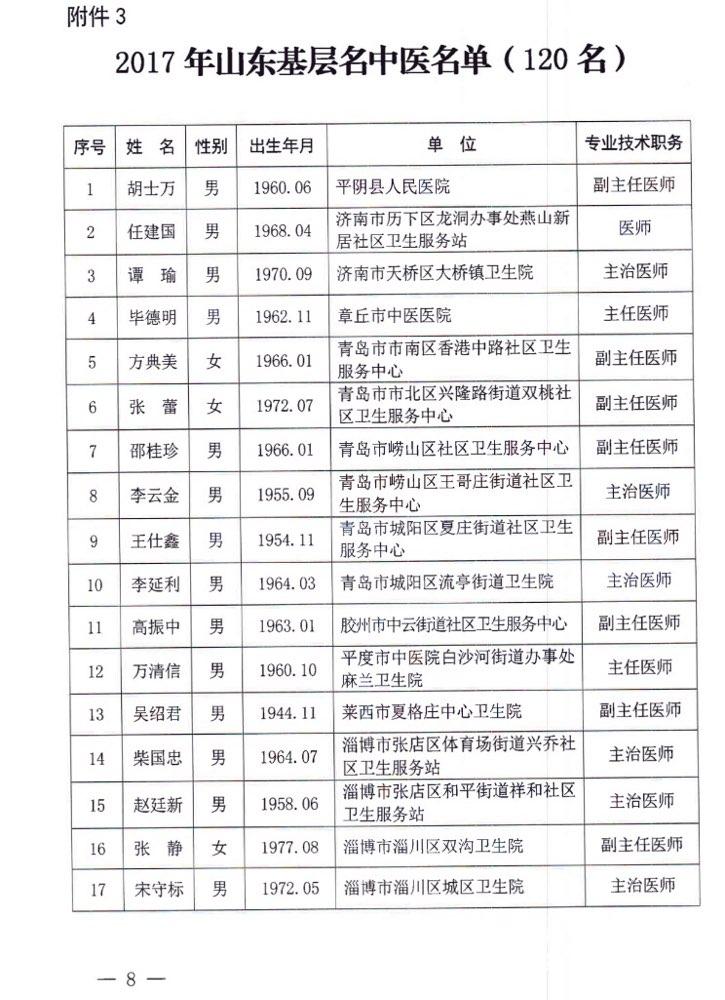 齊魯網(wǎng)6月18日訊(記者 劉冰冰)根據(jù)山東省衛(wèi)生計生委、省人力資源社會保障廳、省中醫(yī)藥管理局要求,2017年山東名老中醫(yī)、山東名中醫(yī)藥專家和山東基層名中醫(yī)名單公布,評選山東中醫(yī)藥大學教授張志剛、山東大學齊魯醫(yī)院教授張繼東等山東名老中醫(yī)10名、山東中醫(yī)藥大學教授張成博、山東省立醫(yī)院主任醫(yī)師牟林茂等山東名中醫(yī)藥專家80名、山東基層名中醫(yī)120。
