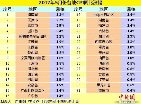 數(shù)據(jù)顯示,海南5月份CPI同比漲幅為3.3%,漲幅全國(guó)最高,也是5月份全國(guó)僅有的CPI漲幅進(jìn)入“3時(shí)代”的地區(qū)。