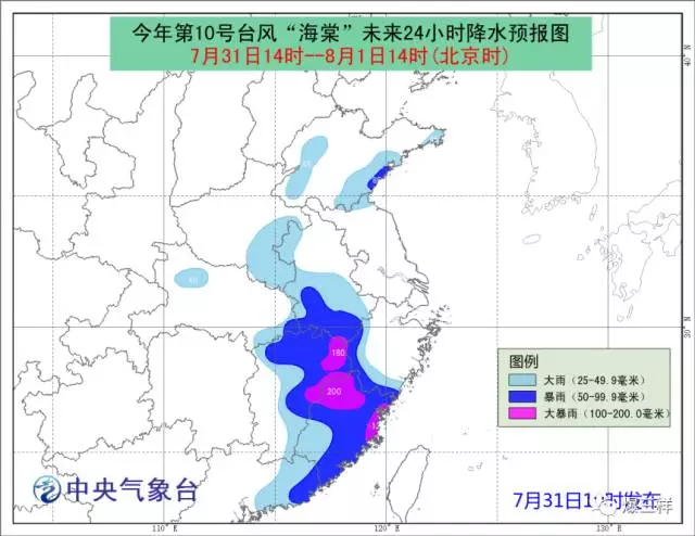 中央氣象臺(tái)7月31日10時(shí)繼續(xù)發(fā)布暴雨黃色預(yù)警:預(yù)計(jì)7月31日14時(shí)至8月1日14時(shí),福建、廣東東部、江西東部和北部、浙江西南部、安徽西南部、湖北東部、河南東南部、山東東南部等地有大雨或暴雨,其中,福建西北部和東部、江西東北部等地的部分地區(qū)有大暴雨(100~200毫米),最大小時(shí)雨強(qiáng)可達(dá)60毫米。