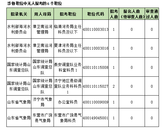 涉魯職位仍有6席無人報(bào)考,分別類屬于水利部海河水利委員會(huì)、國家統(tǒng)計(jì)局山東調(diào)查總隊(duì)和山東省氣象局!氨恪甭毼粸榕R清河務(wù)局主任科員及以下、夏津河務(wù)局主任科員及以下、泰安調(diào)查隊(duì)業(yè)務(wù)科室科員1、濟(jì)寧地區(qū)縣級(jí)調(diào)查隊(duì)業(yè)務(wù)科科員1、濟(jì)寧市氣象局辦公室科員、東營市廣饒縣氣象局科員。