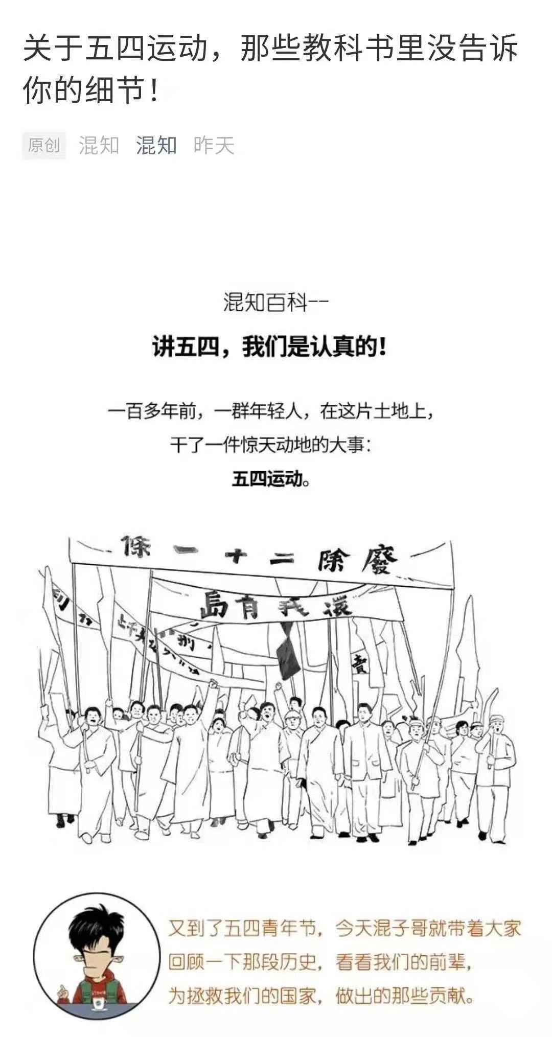 “一群心系國家的進步青年成立了中國共產(chǎn)黨,并聯(lián)合無產(chǎn)階級開啟了新民主主義革命,拯救民族于危難之中……”5月4日,“混知”公眾號上發(fā)表的《關于五四運動,那些教科書里沒告訴你的細節(jié)!》再次引發(fā)關注,閱讀量很快突破10萬!霸瓉砝畲筢、毛澤東、周恩來是上一個80、90后的前輩。同為80、90后的我們不能丟了他們的臉!”網(wǎng)友的留言印證了陳磊團隊的價值,而“混子哥”也將在這條道路上繼續(xù)前行!