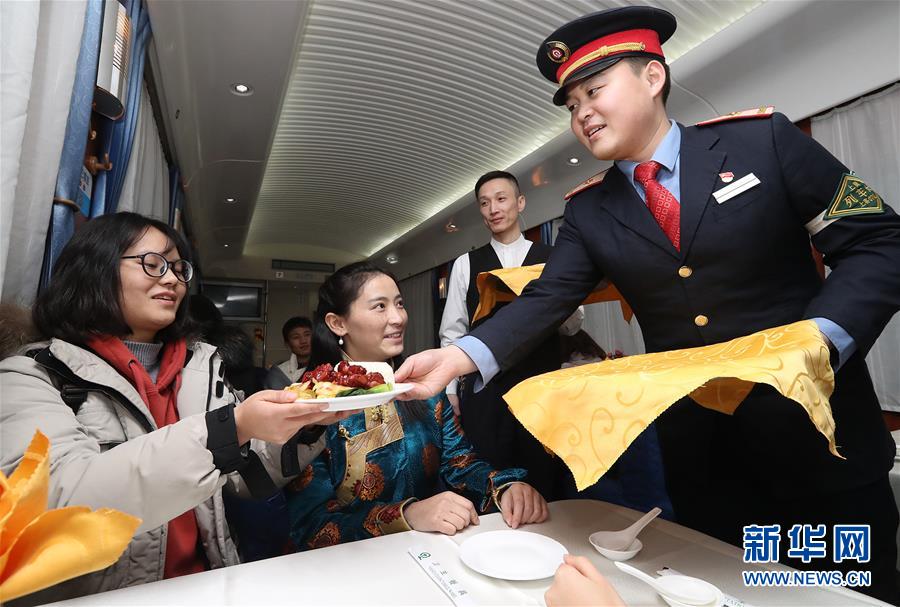 2月7日,乘務員在列車上為返鄉(xiāng)的同濟大學學生送上餐食。近日,在上海至拉薩Z164次列車上,乘務員與旅客開展了“迎新春、送福字、把吉祥美好帶回家”活動,營造暖心的旅程。 新華社記者 陳飛 攝