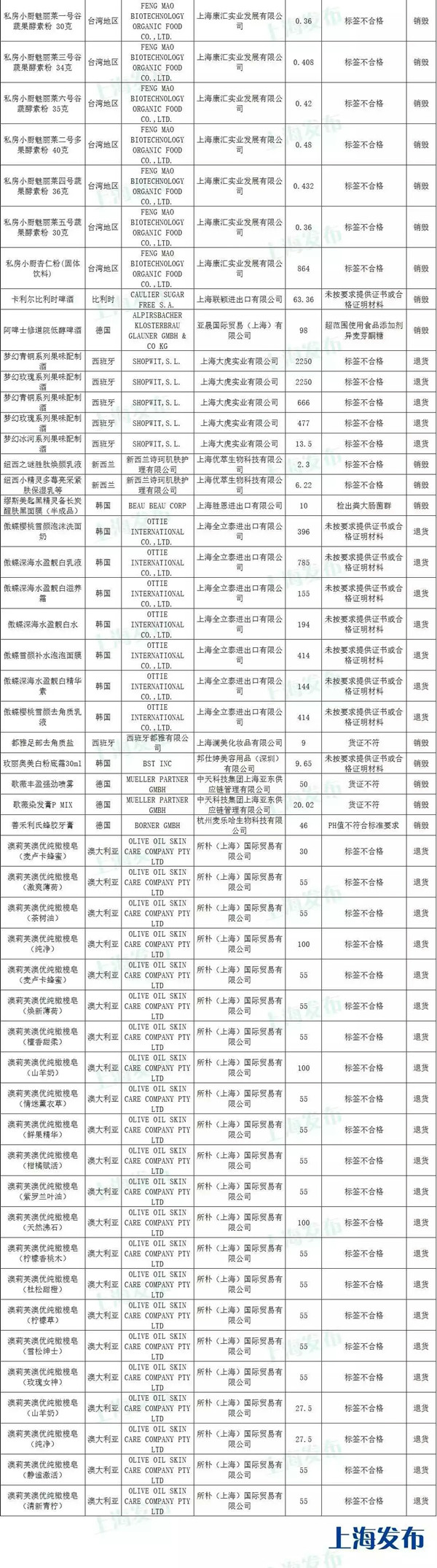 央廣網(wǎng)上海2月10日消息 上海出入境檢驗(yàn)檢疫局今天公布去年12月份未予準(zhǔn)入的進(jìn)境食品、化妝品信息,包括法國產(chǎn)的總統(tǒng)布里奶酪、泰國產(chǎn)的福樂果牌櫻桃干、英國產(chǎn)的瑋致活原味紅茶、德國產(chǎn)的歌薇染發(fā)膏、澳大利亞產(chǎn)的澳莉芙澳優(yōu)純橄欖皂等。未予準(zhǔn)入的產(chǎn)品都已依法作退貨或銷毀處理。