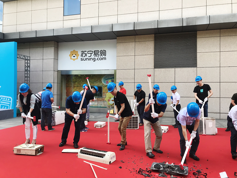 協(xié)會(huì)及企業(yè)老總代表集體砸掉“三高”舊家電(蘇寧供圖)