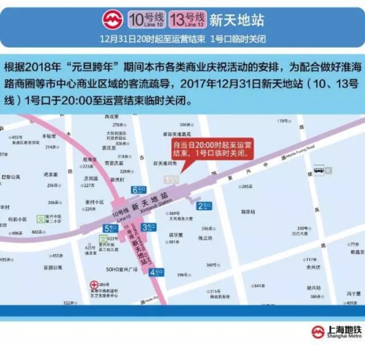 據(jù)上海發(fā)布官方微信,上海發(fā)布準(zhǔn)備跨年夜出去玩的小伙伴們注意啦!申通地鐵集團(tuán)說,12月29-31日,1、2、7、8、9、10號(hào)線執(zhí)行周末延時(shí)運(yùn)行圖。同時(shí),12月31日20點(diǎn)起至運(yùn)營結(jié)束,2、10號(hào)線南京東路站臨時(shí)封站,10、13號(hào)線新天地站臨時(shí)關(guān)閉1號(hào)口。