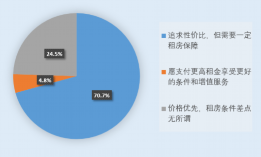 此次調(diào)查顯示,70.7%的受訪者租房觀念為“追求性價比,但需要一定租房保障”(平衡型),4.8%為“愿支付更高租金享受更好的條件和增值服務(wù)”(享受型),24.5%為“價格優(yōu)先,租房條件差點無所謂”(經(jīng)濟(jì)型)。同時,租房觀念與收入水平密切相關(guān),高收入者享受型比例明顯較高,年收入20萬元以上的受訪者中享受型比例為45.1%,而年收入5萬元以下者經(jīng)濟(jì)型比例為24.5%。