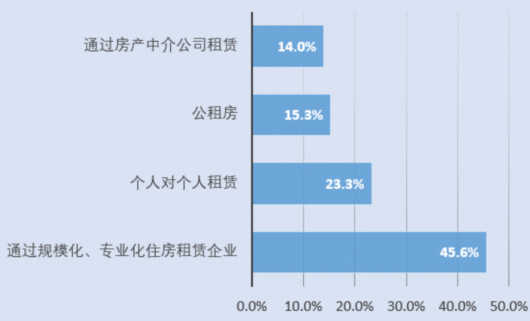 從租房渠道來看,45.6%的受訪者傾向于通過規(guī);、專業(yè)化住房租賃企業(yè),23.3%傾向于個人對個人租賃,15.3%傾向于公租房,14%傾向于通過房產(chǎn)中介公司租賃。