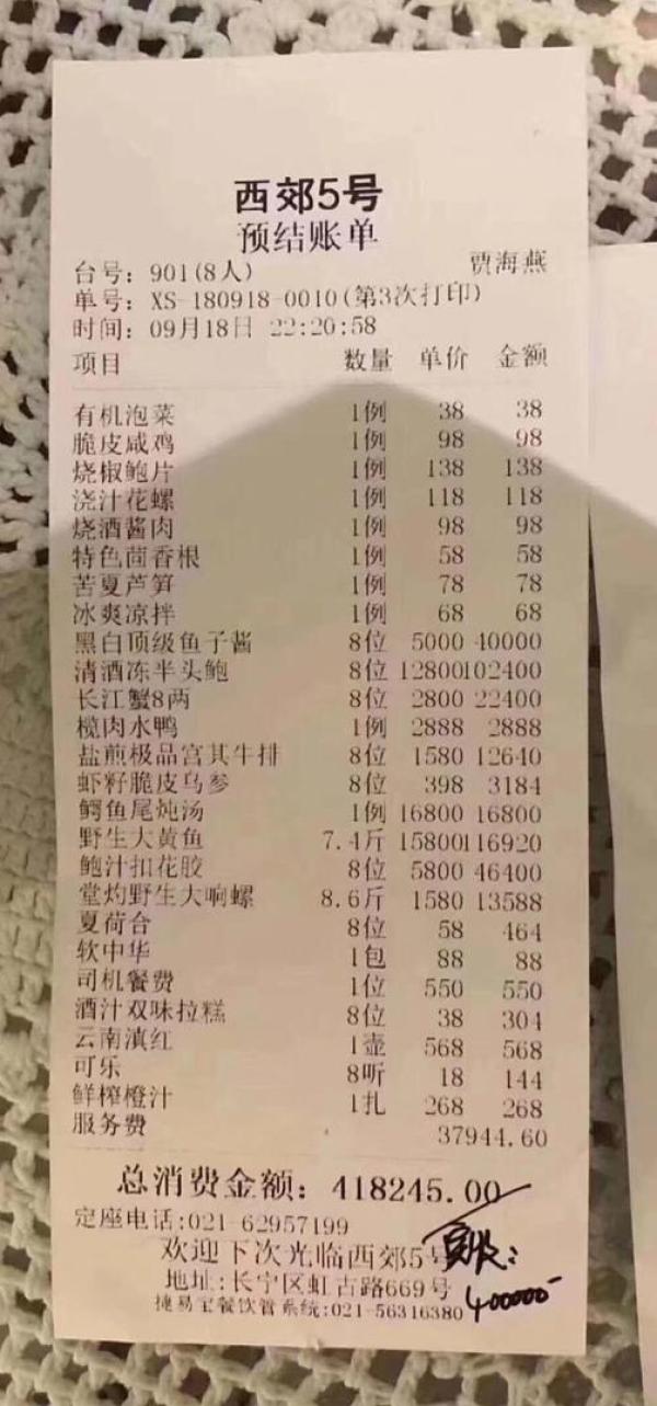 9月19日,一份“天價(jià)賬單”在網(wǎng)上引發(fā)關(guān)注。網(wǎng)傳“天價(jià)賬單”照片顯示,其出自一家名為“西郊5號(hào)”的飯店,位于上海虹古路669號(hào),就餐時(shí)間為9月18晚,8人點(diǎn)了20道菜,最后算上服務(wù)費(fèi),共花費(fèi)418245元,實(shí)付40萬(wàn)元。