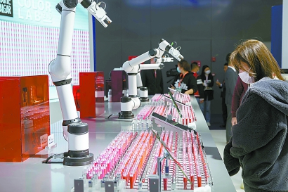 觀眾在參觀一款會(huì)做口紅的“手臂機(jī)器人”。賴鑫琳 攝