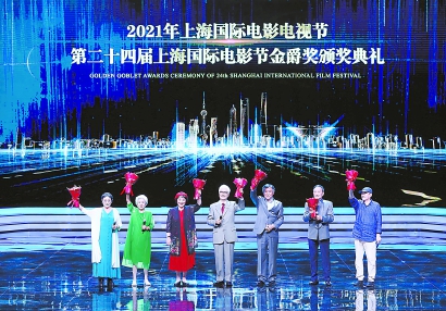 昨晚,第24屆上海國際電影節(jié)金爵獎(jiǎng)?lì)C獎(jiǎng)盛典在滬舉行。電影表演藝術(shù)家走上舞臺(tái),與觀眾分享他們與電影藝術(shù)的不解之緣,與年輕的電影人分享初心和堅(jiān)守。左起:王曉棠、謝芳、祝希娟、梁波羅、達(dá)式常、童自榮、鄭大里。 迪雯 攝