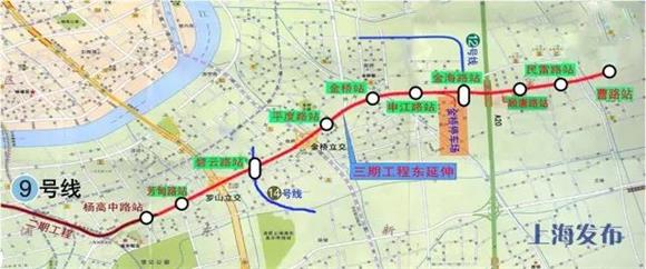 9號(hào)線三期東延伸(起自9號(hào)線二期工程終點(diǎn)楊高中路站,自西向東延伸,終點(diǎn)站曹路站),全長(zhǎng)13.8公里、車站9座。目前全線結(jié)構(gòu)貫通,正在進(jìn)行軌道鋪設(shè)和車站裝修安裝施工。