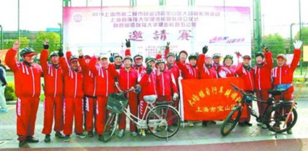 圖片說明:大場鎮(zhèn)自行車騎游隊參加市民運(yùn)動會時合影