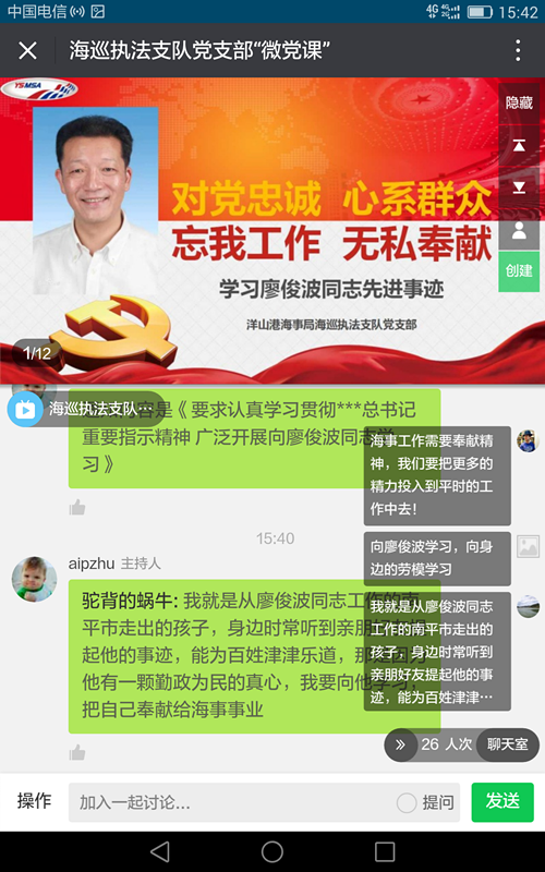 “以前支部上黨課,要把大家集中到會議室里學(xué)習(xí),不僅因為黨員崗位分布廣難以集中,而且學(xué)習(xí)效果還不太理想,F(xiàn)在方便了,大家隨時隨地掏出手機打開微信,就可以在線觀看黨課直播,進行互動學(xué)習(xí),更方便更有效了!苯,洋山港海事局海巡執(zhí)法支隊的黨員小朱高興地告訴記者。