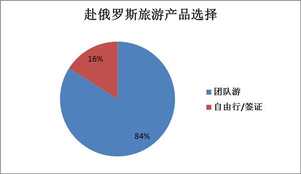 由于免簽的便利,大部分中國游客以跟團的方式赴俄羅斯,占比達到84%。但自己辦理簽證、預訂自由行產(chǎn)品的旅游者也明顯增多。