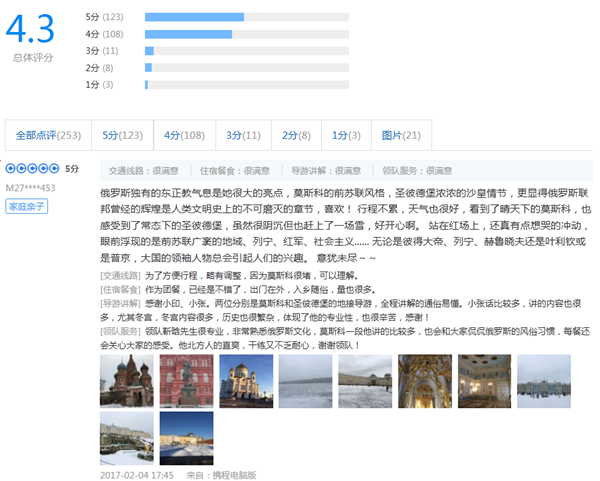 從參團游客的點評看,中國游客對俄羅斯旅游的評價很高,對紅色旅游景點最感興趣。從網(wǎng)上數(shù)百條熱門產(chǎn)品的點評看,平均分達到4.6分以上(滿分5分)。