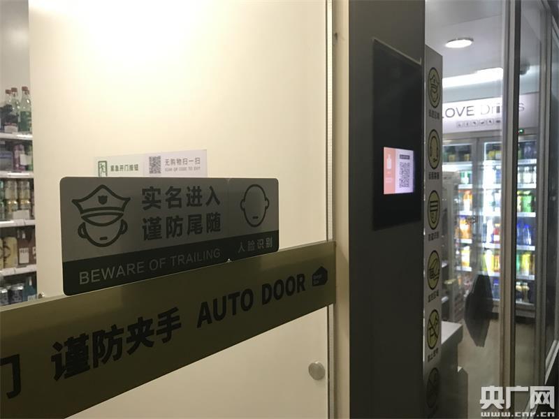 無人超市門口提示標識:“實名進入 謹防尾隨”