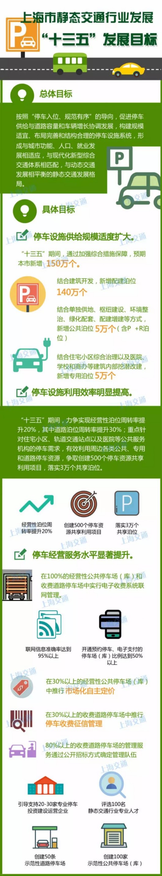 據(jù)上海發(fā)布,市交通委發(fā)布《上海市靜態(tài)交通行業(yè)發(fā)展“十三五”規(guī)劃》:①“十三五”期間預(yù)期本市將新增150萬個泊位;②力爭實現(xiàn)經(jīng)營性泊位周轉(zhuǎn)率提升20%,其中道路泊位周轉(zhuǎn)率提升30%;③提升經(jīng)營性公共停車場(庫)經(jīng)營服務(wù)水平;④利用既有的公共、道路、專用等各類停車資源向周邊住宅小區(qū)、醫(yī)院、學校等錯時開放共享,同步促進充電設(shè)施分時共享;⑤開展公共停車場(庫)收費管理區(qū)域試點,修訂完善本市公共停車收費管理規(guī)定;⑥進一步加大停車綜合治理力度?聪挛膅et規(guī)劃要點吧