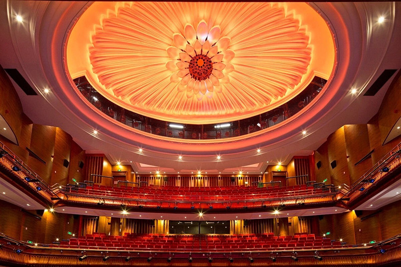 在室內(nèi)設(shè)計上,采用了“風(fēng)格性修復(fù)”的思路:正門大廳的大理石地坪上鑲嵌著半幅太陽花三星圖案,與建筑雙塔正立面圖案上下呼應(yīng),暗示著“中國大戲院”前身作為“三星大舞臺”的歷史文脈;各樓層休息廳的天花造型也延續(xù)了歷史遺存的天花風(fēng)格,營造著歐式古典的空間感;而最為美倫美奐的當(dāng)屬劇場觀眾廳穹頂,中心錯落有致的兩層共32瓣花瓣組成了一朵盛開的蓮花,在燈光的烘托下,高浮雕蓮花紋光影透疊,層次分明而又工整細膩,無處不彰顯這座富有歷史底蘊的劇院魅力。