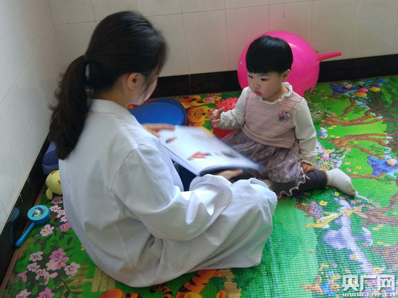 康復(fù)治療師在通過(guò)識(shí)圖游戲和孩子互動(dòng)