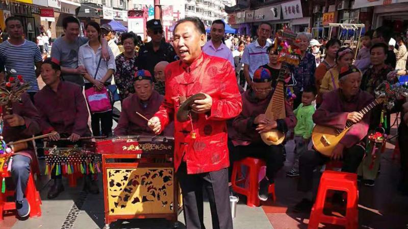 這一屆民展會除了明清時期原汁原味的清音班扎彩演奏行街表演外,還有新的亮點:國家級非遺項目——浦東說書走上街頭表演,演唱者計金弟為游客獻上他的新作。
