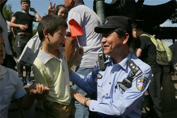 圖說:民警諸建國提醒兒童跟緊家長。青浦警方 供圖
