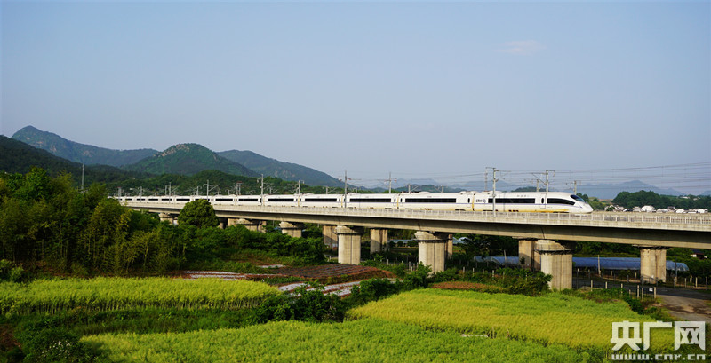 “復興號”列車飛馳在杭黃高鐵線上。 (央廣網(wǎng)發(fā) 中國鐵路上海局集團有限公司提供)