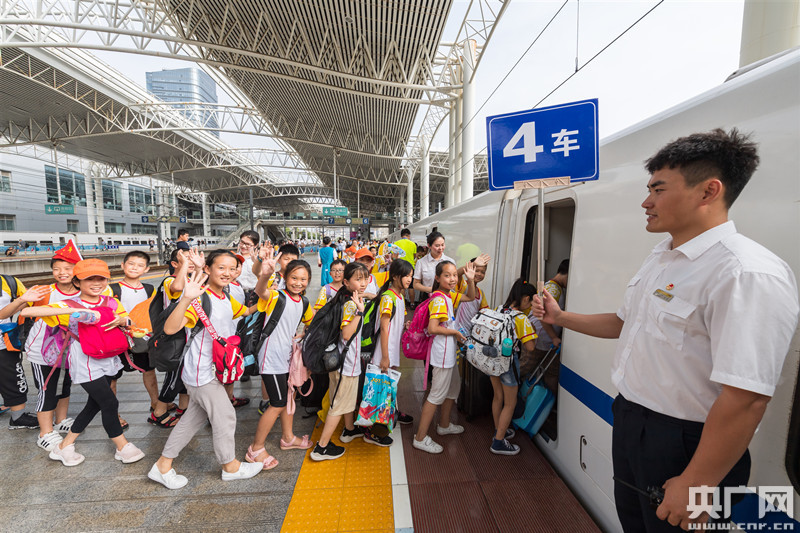 一群小朋友旅客在常州站客運人員引導下有序上車。 (央廣網發(fā) 李忱 攝)