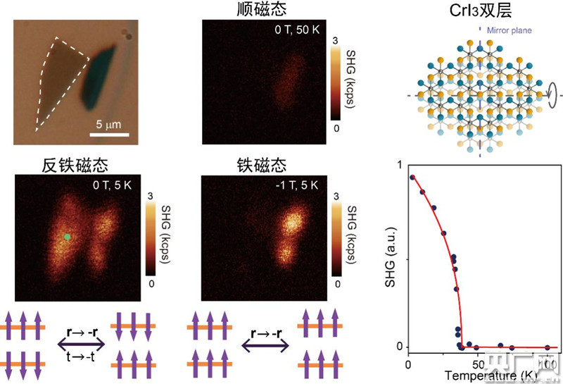 光學(xué)二次諧波過程對體系的對稱性高度敏感,光學(xué)二次諧波的探測方法從體系的對稱性入手,能夠靈敏地探測體系的反鐵磁性。與通常探測磁性的實驗手段不同,它不依賴于材料的宏觀磁性,而取決于微觀磁結(jié)構(gòu)造成的對稱破缺。雙層三碘化鉻在反鐵磁態(tài)下,其磁結(jié)構(gòu)不但打破了時間反演對稱性,也同時打破了空間反演對稱性,由此產(chǎn)生強烈的非互易二次諧波響應(yīng)。當體系升至轉(zhuǎn)變溫度以上、或施加面外磁場拉為鐵磁態(tài)后,磁結(jié)構(gòu)的對稱性卻發(fā)生了改變,這一二次諧波信號也隨之消失。