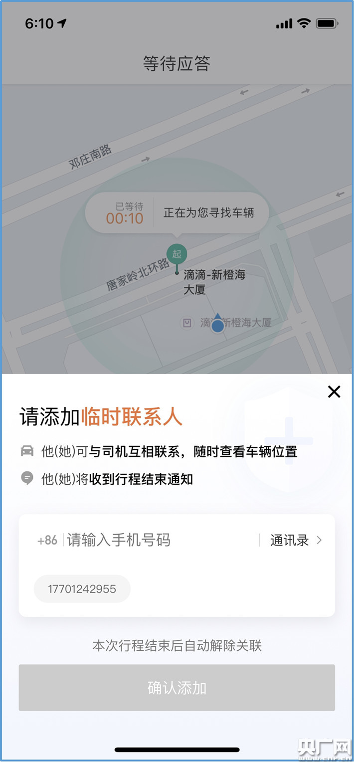 平臺將引導(dǎo)乘客添加臨時聯(lián)系人(央廣網(wǎng)發(fā) 滴滴提供)