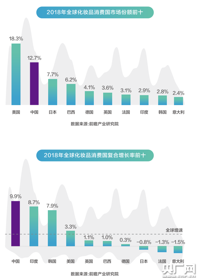 2018年全球化妝品消費(fèi)國(guó)市場(chǎng)份額及復(fù)合增長(zhǎng)率Top10(央廣網(wǎng)發(fā) 奉賢區(qū)新聞辦供圖)