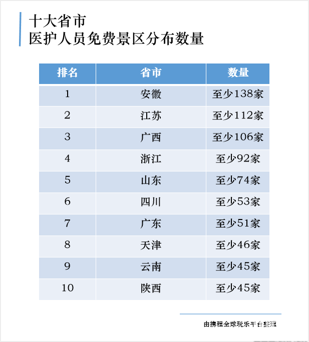攜程還公布了對(duì)醫(yī)護(hù)人員免費(fèi)景區(qū)最多的十大省份,前十名分別是安徽、江蘇、廣西、浙江、山東、四川、廣東、天津、云南和陜西。前三名的省份,提供醫(yī)護(hù)人員優(yōu)待政策的景區(qū),均超過一百家,安徽以138家優(yōu)待景區(qū)排名第一,江蘇、廣西以112家、106家緊隨其后。