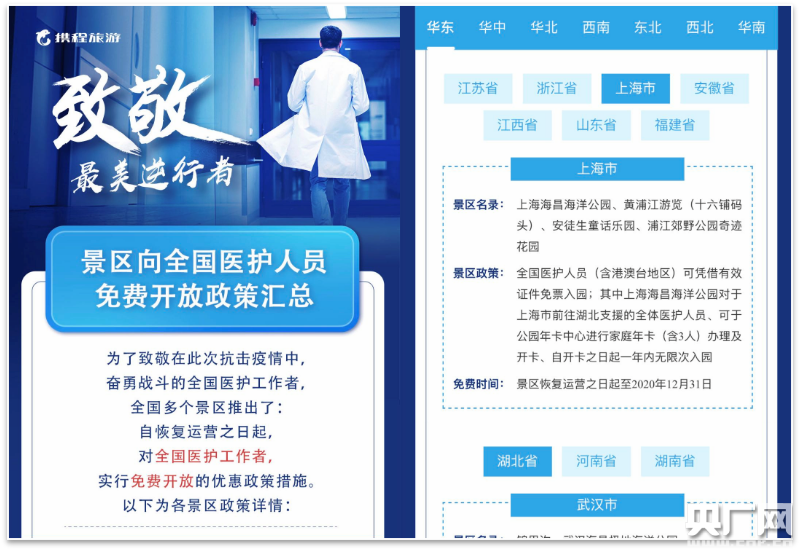 本文圖片:首批國(guó)內(nèi)景區(qū)開放,超1000家景區(qū)對(duì)醫(yī)護(hù)人員免費(fèi)(央廣網(wǎng)發(fā) 攜程供圖)