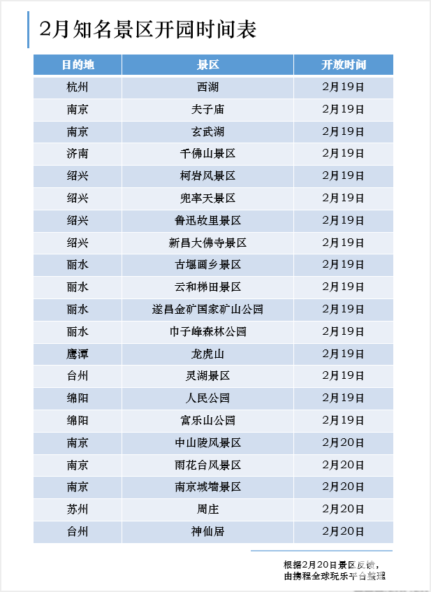 部分地區(qū)的多個(gè)景區(qū)也加入了開放的行列。2月20日,攜程全球玩樂平臺(tái)發(fā)布了首批“知名景區(qū)開放時(shí)間表”,根據(jù)景區(qū)公布的信息,西湖、夫子廟、玄武湖、千佛山景區(qū)、柯巖風(fēng)景區(qū)、兜率天景區(qū)、新昌大佛寺景區(qū)、魯迅故居寄景區(qū)、古堰畫鄉(xiāng)景區(qū)、云和梯田景區(qū)、中山陵風(fēng)景區(qū)、雨花臺(tái)風(fēng)景區(qū)、南京城墻景區(qū)、龍虎山、周莊、神仙居等20多家知名景區(qū)已公布開園。而在3月初更多景區(qū)將集中開放,包括云上草原、安吉靈溪山風(fēng)景區(qū)、大明山景區(qū)等預(yù)計(jì)將在3月1日迎來開放。
