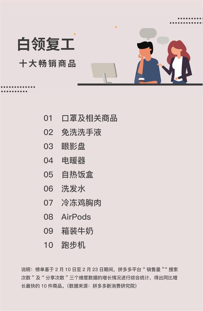 日前,拼多多對(duì)平臺(tái)消費(fèi)數(shù)據(jù)尤其是三線以上復(fù)工密集城市的消費(fèi)數(shù)據(jù)進(jìn)行了分析,得出“白領(lǐng)復(fù)工10大熱銷商品”榜單。其中,既有口罩及相關(guān)衍生品,又有自熱飯盒、眼影盤等解決吃和用的商品。
