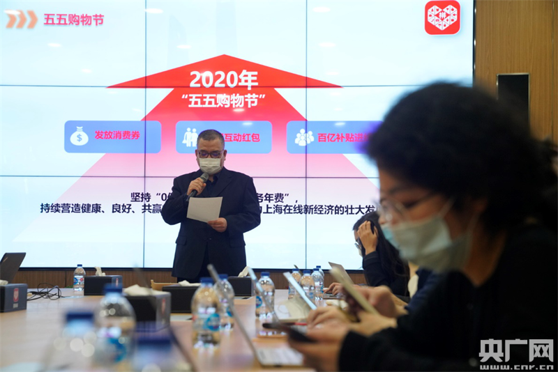 4月23日,拼多多宣布,將投入15億元現(xiàn)金及補(bǔ)貼,聯(lián)合10000家上海品牌和企業(yè),全力支持上海市“五五購(gòu)物節(jié)”。拼多多高級(jí)副總裁王堅(jiān)正在介紹平臺(tái)助力“五五購(gòu)物節(jié)”的具體舉措。(本文圖片:央廣網(wǎng)發(fā) 李勝 攝)