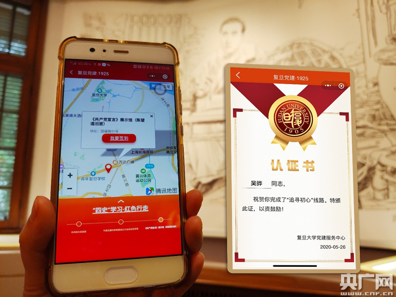 打開“復(fù)旦黨建·1925”微信小程序,全國黨建工作標(biāo)桿院系物理學(xué)系黨委書記吳驊在“定向活動”模塊看到了一條個性定制的紅色行走路線。路線顯示以《共產(chǎn)黨宣言》展示館為起點,途徑中共一大會址紀(jì)念館,最終在中共二大會址紀(jì)念館完成行走。在相應(yīng)場館完成線下學(xué)習(xí)后,黨員們點擊“我要簽到”,即在線上成功打卡。完成路線上的所有打卡后,一張專屬的認(rèn)證書自動生成。