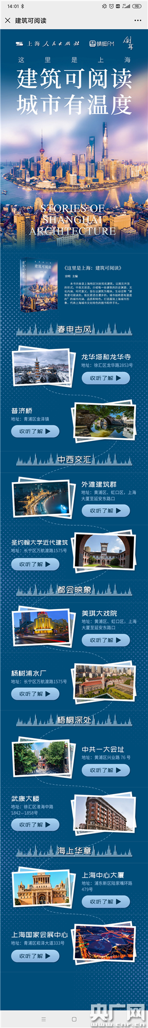 作為“建筑可閱讀”文旅融合工作的重點(diǎn)項(xiàng)目,上海城市推廣中心出品的《這里是上海:建筑可閱讀》已于今年上海書展期間隆重亮相。《這里是上海:建筑可閱讀》有聲版也于今天首發(fā)。由有聲版邀請了“側(cè)耳”團(tuán)隊印海蓉、施琰、陶淳、王幸、林牧茵、徐惟杰、臧熹和葉子龍等八位滬上知名的新聞主播、主持人參與錄制,讓上海的知名建筑可見、可讀、可聽,為廣大讀者帶來全新的視聽體驗(yàn)。