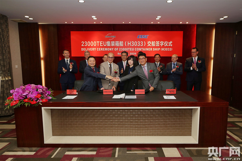 世界首艘23000TEU雙燃料動(dòng)力集裝箱船“達(dá)飛雅克?薩德”號(hào),在上海長(zhǎng)興島造船基地命名交付(央廣網(wǎng)發(fā) 中船集團(tuán)提供)